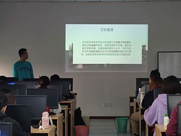 2018级信息管理与信息系统专业开展组织了一场简短而重要的班会。主题是学习学生公寓管理办法、校外住宿管理办法、宿舍卫生管理办法。本次班会的主持人是管信二班的生活委员穆青松,由他在讲台上展示PPT并讲解。
