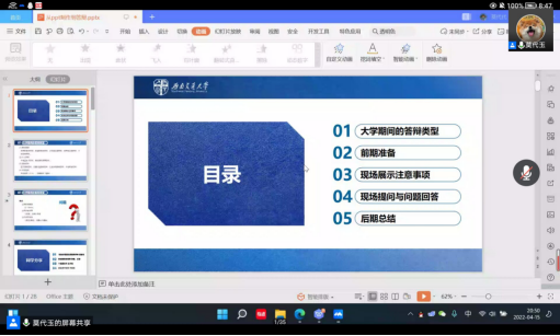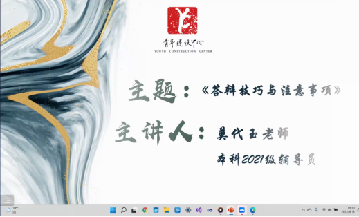 2022年4月15日下午,“星火经英”计划第九期第五次团干部培训在线上举行。本次培训主讲人是2021级辅导员莫代玉,主题为“答辩技巧与注意事项”。本次培训旨在培养团干部的综合能力,提高团干部的答辩水平,让团干部掌握更多答辩技巧。