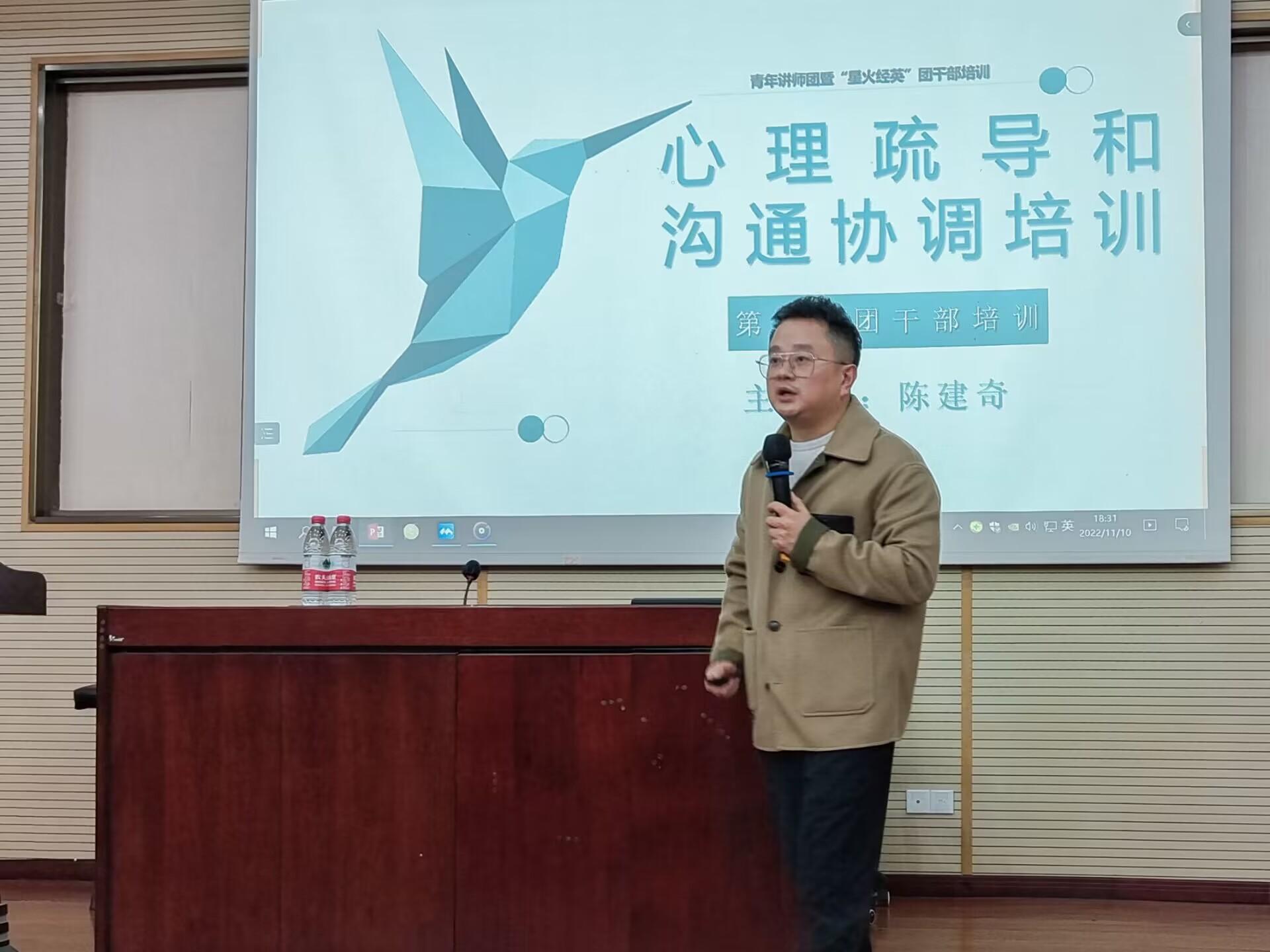 本科2020级辅导员、青年志愿者协会指导老师陈建奇主讲,培训主题为“心理疏导和沟通协调培训”,旨在让团干部们了解心理疏导,明白进行大学生心理疏导以及沟通的重要性以及如何开展。