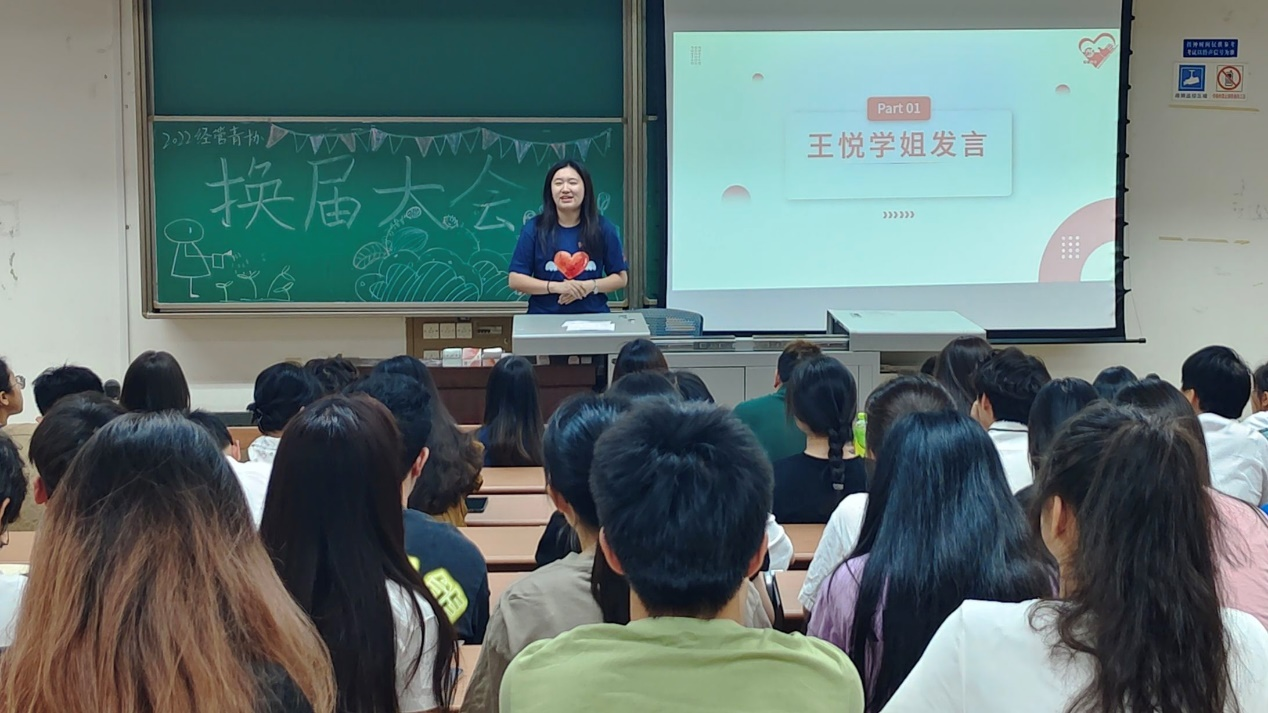 会议伊始,2022届经管青协会长王悦首先发言,王悦总结了过去一年来青协的收获与不足,同时也对主席团的工作做了简短的总结,希望下一届青协骨干有所突破,有所创新。