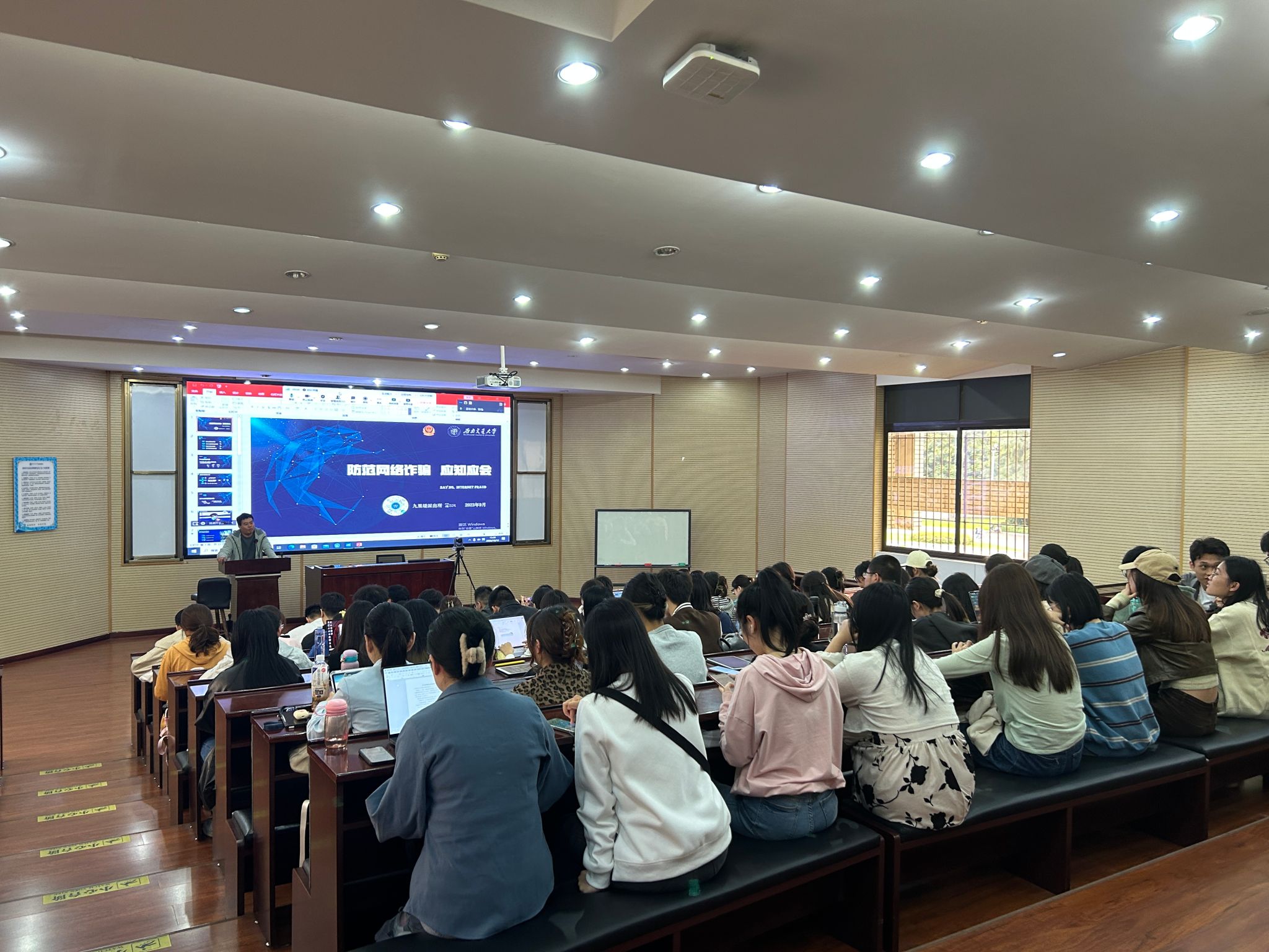 邀请九里堤派出所民警为全体研究生新生开展了一场反诈讲座。讲座邀请到了九里堤派出所具有多年防诈经验的民警赵磊主讲,研究生辅导员贺小轩、李勇也出席了讲座。