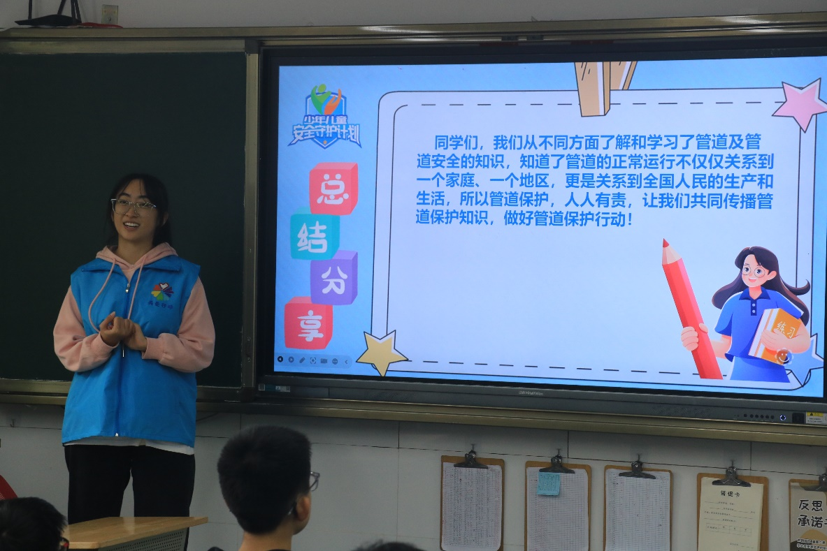 此次课程详细介绍了油气管道在国家能源供应体系中的核心地位,以及维护管道安全对于保障国家能源安全和促进经济社会可持续发展的重大意义。同时,列举了一些威胁管道安全的具体行为,如非法占用管道用地、破坏管道设施等,并强调了遵守法律法规的重要性。有效激发了学生们对管道保护的兴趣,增强了他们的环保意识和社会责任感,帮助他们在成长过程中树立正确的能源保护观念。