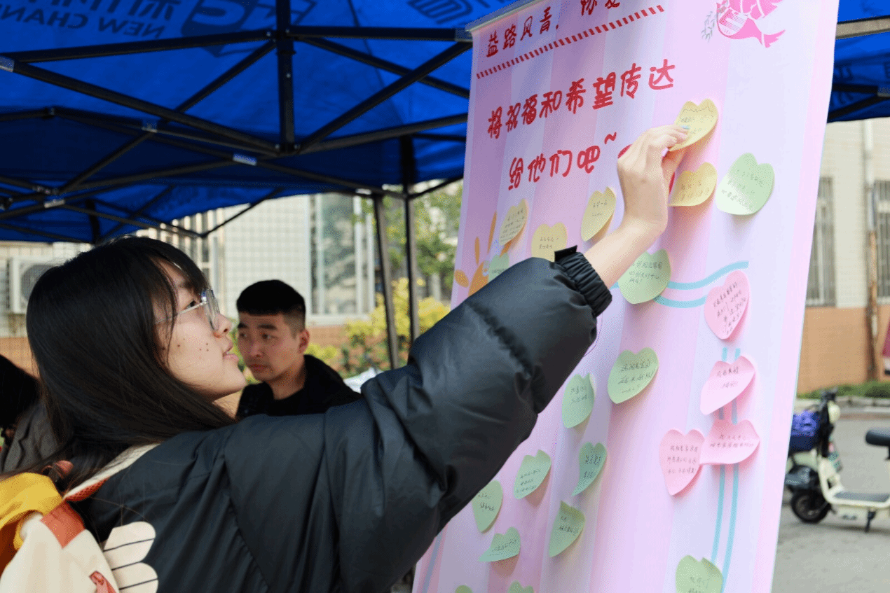 活动现场特别设置了一块爱心寄语留言板,这里成为了大家抒发内心温暖与希望的空间。参与者们在选购之余,还可以写下自己对阳光家园“大朋友们”的美好祝愿,这些充满关怀的话语汇聚成一幅幅温馨的画面,彰显了社会的温情与力量。