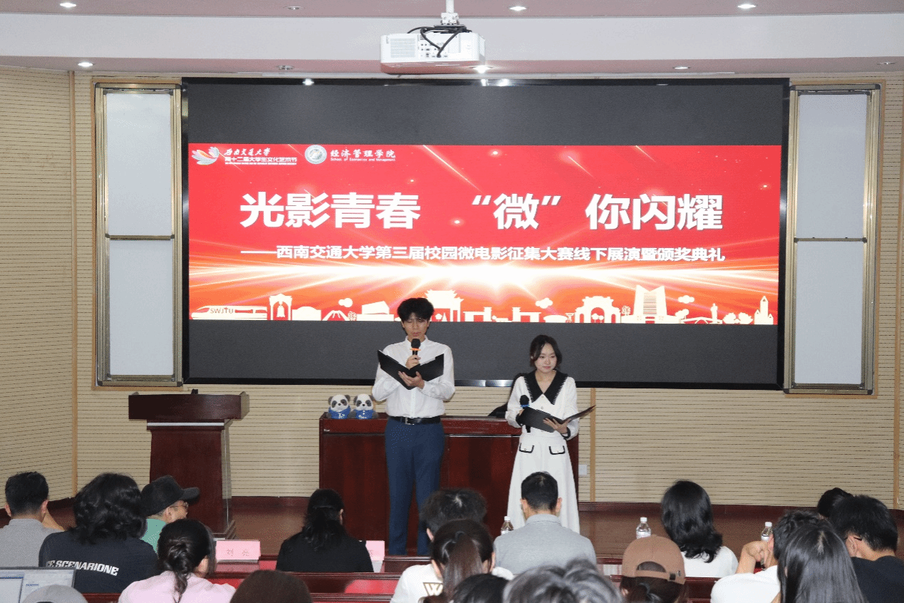 经过评委打分和大众评审投票,各奖项逐一揭晓,由各嘉宾老师为获奖队伍代表颁奖并合影留念。活动最后,余小英老师进行致辞。她表示,此次微电影大赛作品,反映出新时代青年热爱生活、积极进取的精神风貌,给予观众们灵魂和情感的滋养。此次微电影大赛不仅是一场视听盛宴,更是同学们展现创意与才华的重要平台,未来将继续搭建此类交流展示的舞台。期望同学们永远保持赤子之心,用镜头寻找光的方向,在未来的银幕上,继续书写属于新时代交大青年的光影诗篇。