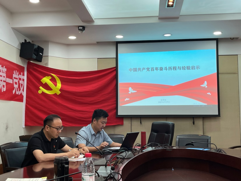 党支部优秀党员代表晏理斌首先为大家讲了题为“中国共产党百年奋斗历程与经验启示”党课。他讲到,学习党史,必须坚持历史四维,树立大历史观;要准确把握党的历史发展主题主线、主流本质;要坚决抵制和批判历史虚无主义。