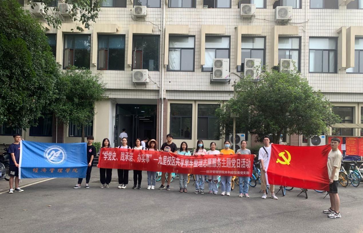 本科经贸类党支部在5月27日下午举办了以“学党史、践承诺、办实事”为主题的九里校区共享单车整理志愿服务主题党日活动。