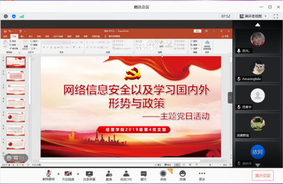 硕士2019级第四党支部于2021年1月14日晚上20点在腾讯会议上开展了“网络信息安全和国内外形势与政策”主题党日活动。