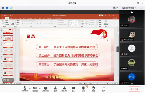 此次活动分为三个部分。第一部分是学习关于网络信息安全的重要论述。罗雨杰同志首先播放了学习强国上的一个视频,向大家介绍了坚持总体国家安全观,是习近平新时代中国特色社会主义思想的重要内容。并截取了习近平总书记阐述“维护网络安全”的部分精彩论述。